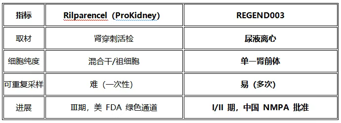 相較之下,REGEND003完全采用無創尿液提取方式,且可多次采樣,獲得的腎前體細胞純度更高,劑量更精準,有望進一步提升療效并降低潛在不良反應風險。