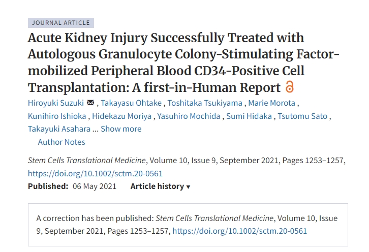 Hiroyuki Suzuki, Takayasu Ohtake, Toshitaka Tsukiyama, Marie Morota, Kunihiro Ishioka, Hidekazu Moriya, Yasuhiro Mochida, Sumi Hidaka, Tsutomu Sato, Takayuki Asahara, Shuzo Kobayashi, Acute Kidney Injury Successfully Treated with Autologous Granulocyte Colony-Stimulating Factor-mobilized Peripheral Blood CD34-Positive Cell Transplantation: A first-in-Human Report, Stem Cells Translational Medicine, Volume 10, Issue 9, September 2021, Pages 1253–1257, https://doi.org/10.1002/sctm.20-0561