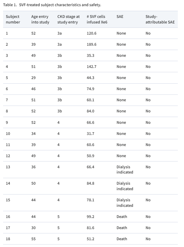 監測三個階段的安全性:(1) 與侵入性操作相關的急性事件,(2) SFV 輸注后的急性全身反應,以及 (3) SVF 輸注后的長期臨床事件。脂肪抽吸術、腎動脈經主動脈導管插入術和 SVF 細胞輸注均已進行,沒有因這些操作引起的不良事件。沒有注意到過敏反應。