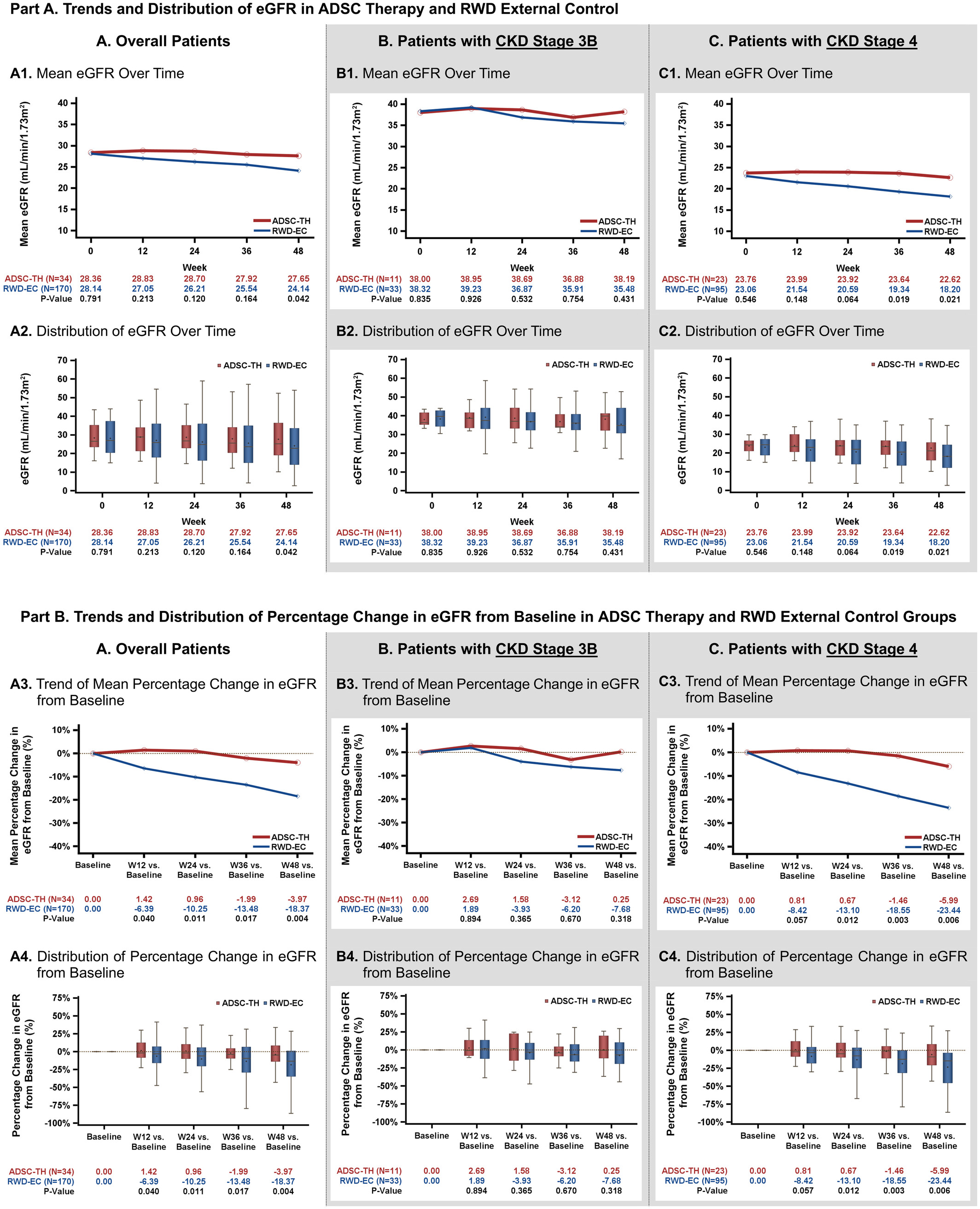 在CKD3期,兩組的eGFR百分比變化無顯著差異,表明總體穩定性良好。然而,在CKD4期,RWD EC組與ADSC治療組相比出現了統計學上的顯著下降,這表明在晚期CKD患者中,ADSC治療組的短期腎功能軌跡更加穩定。