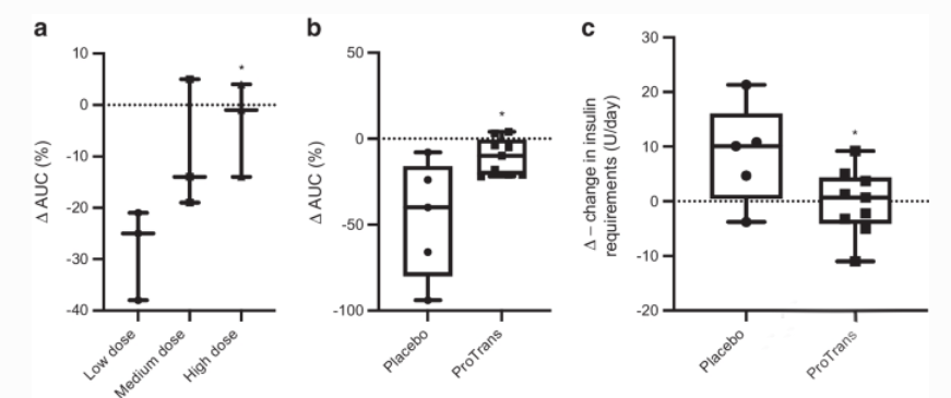 ● 安慰劑治療組的C肽AUC水平下降了47%,而干細胞治療組僅下降了10%,兩組有顯著差異(p<0.05)。見下圖b