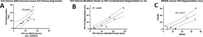 ABC/2模型1和模型2分割方法通過ICH和IVH體積的線性回歸顯示出良好的相關性(圖3a、b)。與模型2分割體積方法(例如,每個CT15-20分鐘)相比,模型1ABC/2派生的半定量方法和改進的Graeb IVH方法完成時間較短(例如,2-5分鐘)。有趣的是,NIHSS評分與IVH體積M2方法的比較顯示出線性相關性(2 ?= 0.7217),并且當IVH小于20mL或大于20mL時,NIHSS評分似乎出現聚類(圖3c)。PHE分析顯示MSC注射劑量和PHE體積之間存在輕微的負相關關系。
