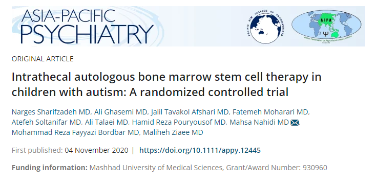近年來,馬什哈德醫(yī)科大學(xué)在《Wiley Online Library》雜志上發(fā)布了一篇《自閉癥兒童鞘內(nèi)自體骨髓干細(xì)胞治療:一項(xiàng)隨機(jī)對照試驗(yàn)》,結(jié)果顯示鞘內(nèi)注射自體骨髓間充質(zhì)干細(xì)胞似乎是安全可行的,但在治療兒童自閉癥方面的臨床療效有限。
