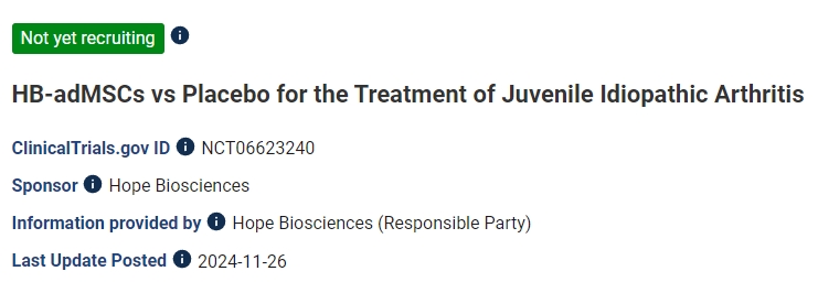 參考資料:https://www.businesswire.com/news/home/20241218670652/en/Hope-Biosciences-Research-Foundation-Authorized-to-Begin-Phase-II-Clinical-Trial-in-Stem-Cell-Therapy-for-Juvenile-Idiopathic-Arthritis