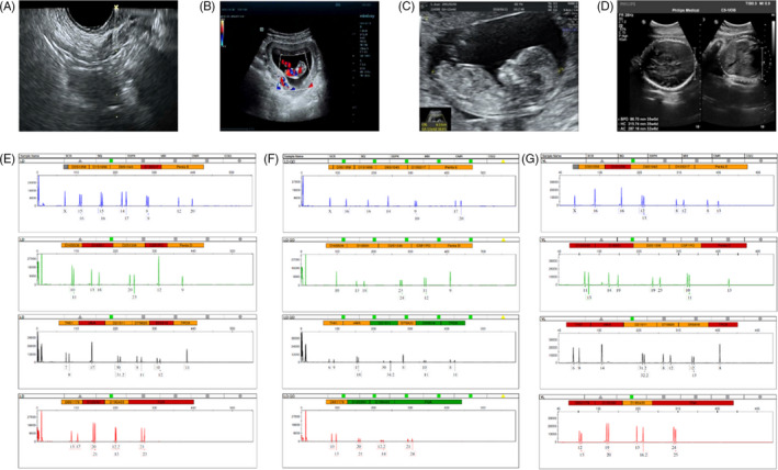收集了15名接受取卵的患者的基本特征,包括取卵周期、胚胎移植和妊娠次數。一般來說,四個胎兒沒有出生缺陷,三個胚胎來自ICSI的受精類型,而最后一個是自然受孕的。1例術中超聲掃描顯示,在經陰道超聲(TVUS)引導下,卵巢未見間質增生或其他異常卵巢結構(圖2A)。這名婦女在體外受精后成功懷孕,并在第8周進行了基本產前程序的超聲掃描(圖2B),第13周(圖2C) 和第32周 (圖二維) 顯示正常的胎兒發育。微衛星位點分析顯示,胎兒(圖2F)與母親有遺傳關系(圖2E) 供體UCMSC以外的其他人(圖2G)。