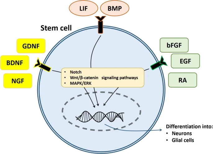 干細胞的命運取決于鄰近細胞分泌的因子。腦源性神經營養因子 (BDNF)、神經生長因子 (NGF) 和膠質細胞源性神經營養因子 (GDNF) 引導干細胞向神經元分化。堿性成纖維細胞生長因子 (bFGF)、表皮生長因子 (EGF) 和視黃酸 (RA) 已被證實能夠刺激干細胞向神經元分化,而白血病抑制因子 (LIF) 和骨形態發生蛋白 (BMP) 則促進膠質細胞分化。