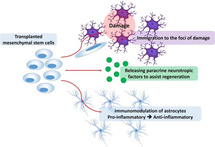 研究表明,干細胞能夠通過減少炎癥和防止神經元進一步受損來發揮神經保護作用。干細胞可以分泌抗炎因子,包括白細胞介素10 (IL-10) 、轉化生長因子 β (TGF-β)和吲哚胺 2,3-雙加氧酶 (IDO) 。通過抑制炎癥,干細胞可以創造有利于組織修復和再生的環境。