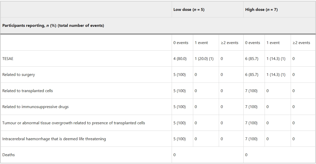 - 主要目標(biāo):評(píng)估 bemdaneprocel 細(xì)胞移植后1年的安全性和耐受性,基于不良事件發(fā)生率進(jìn)行分析。