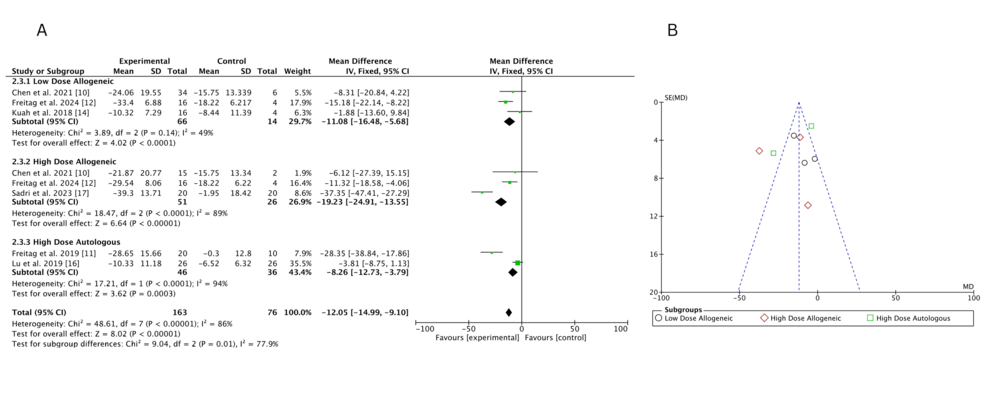 低劑量異基因AD-MSCs在Chen等(2021年)和Freitag 等(2024年)研究中僅表現(xiàn)出小幅改善(MD 分別為 – 6.46 和 – 3.24),Kuah 等(2018 年)因置信區(qū)間寬泛,療效不確定性突出。高劑量異基因 AD-MSCs 在 Sadri 等(2023 年)研究中實現(xiàn)強效改善,F(xiàn)reitag 等(2024 年)也觀察到顯著但較溫和的效果(MD=-5.81),但 Chen 等(2021 年)因置信區(qū)間較寬,效果存疑。高劑量自體 AD-MSCs 在 Freitag(2019 年,MD=-17.00)和 Lee(2019 年,MD=-17.13)等研究中均顯示顯著改善,即使 Kim 等(2023 年)的中等效果(MD=-5.60)仍優(yōu)于低劑量組。高劑量與低劑量異基因組的直接比較因置信區(qū)間重疊,未顯示明確劑量優(yōu)勢。