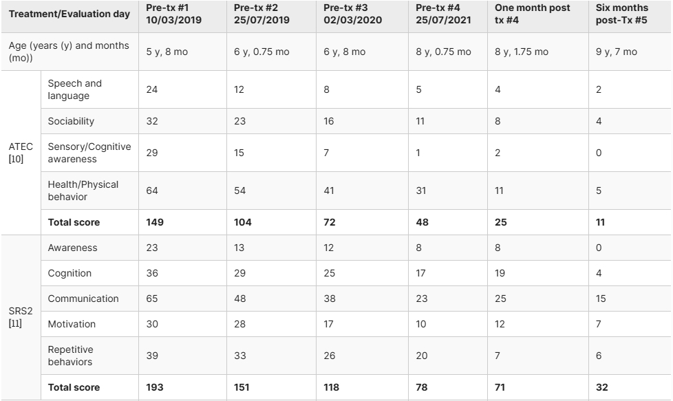 討論:該患兒患有重度自閉癥譜系障礙(ASD)、難治性癲癇發(fā)作和胃腸道癥狀,在接受五次異基因MSCT治療后,持續(xù)表現(xiàn)出積極的臨床反應(yīng)(表2)。改善包括自閉癥行為的典型特征減少、癲癇發(fā)作和胃腸道癥狀消退、社交技能和情緒表達(dá)能力改善,以及病理性腦電圖恢復(fù)正常。