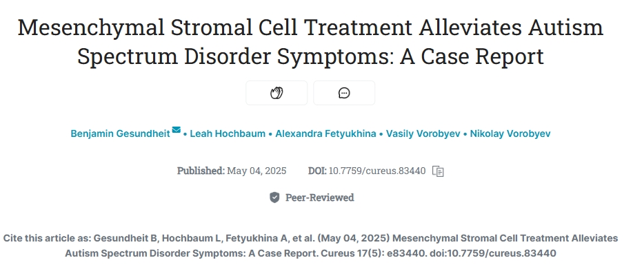 [1]Gesundheit B, Hochbaum L, Fetyukhina A, et al. (May 04, 2025) Mesenchymal Stromal Cell Treatment Alleviates Autism Spectrum Disorder Symptoms: A Case Report. Cureus 17(5): e83440. doi:10.7759/cureus.83440