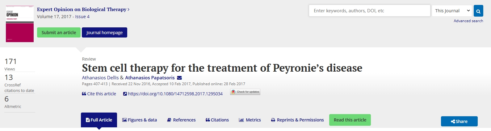 Dellis A, Papatsoris A. Stem cell therapy for the treatment of Peyronie’s disease. Expert Opin Biol Ther. 2017 Apr;17(4):407-413. doi.org/10.1080/14712598.2017.1295034