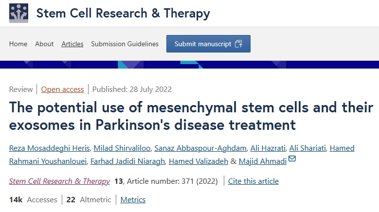 Heris, R.M., Shirvaliloo, M., Abbaspour-Aghdam, S. et al. The potential use of mesenchymal stem cells and their exosomes in Parkinson’s disease treatment. Stem Cell Res Ther 13, 371 (2022). https://doi.org/10.1186/s13287-022-03050-4