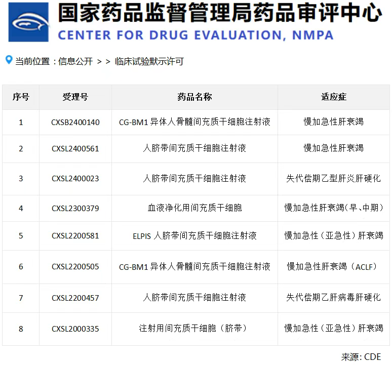 據國家藥監局藥品審評中心數據顯示:截止2025年5月30日,國家已默示許可72款間充質干細胞類藥物臨床試驗,其中8款用于肝病治療(占比近12%),且6項直接針對肝衰竭。這不僅反映出國家對干細胞治療肝病的重視,也說明這一領域已成為干細胞藥物研發的重要方向。[6]