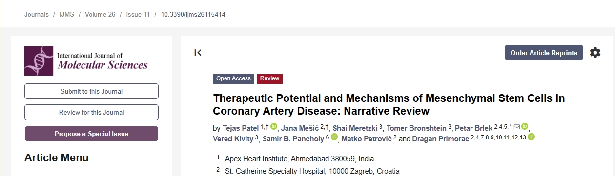 [1]Patel,T.; Me?i?,J.; Meretzki, S.; Bronshtein, T.; Brlek, P.; Kivity, V.; Pancholy, S.B.; Petrovi?, M.; Primorac, D. Therapeutic Potential and Mechanisms of Mesenchymal Stem Cells in Coronary Artery Disease: Narrative Review. Int.J.Mol.Sci.2025,26,5414. https://doi.org/10.3390/ijms26115414