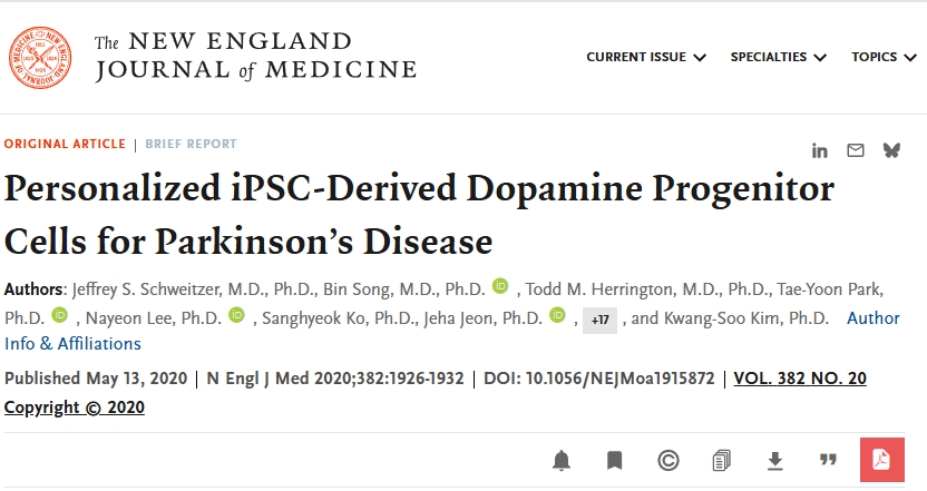 首例自體細胞移植實踐:2020年在《新英格蘭醫學雜志》上發表了一篇“個性化iPSC衍生多巴胺祖細胞治療帕金森病”的研究報告,這是全球首例開展的自體誘導多能干細胞移植治療帕金森病的臨床試驗。試驗報告了將患者來源的中腦多巴胺能祖細胞植入一名特發性帕金森病患者的案例,通過分階段向患者雙側殼核立體定向植入400萬自體源多巴胺神經元。