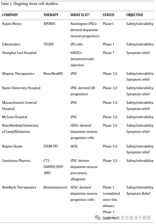 日本京都大學(iPSC來源):關鍵臨床試驗成果:I/II期試驗中,7例患者接受雙側腦移植,24個月內無腫瘤或嚴重副作用,多巴胺生成增加44.7%,4/6患者停藥后運動癥狀改善。