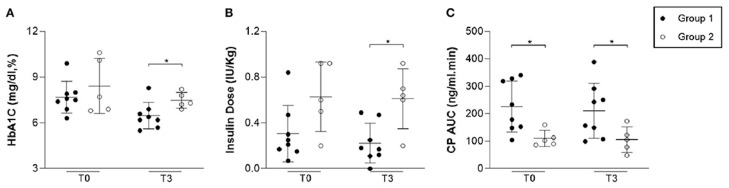 (A) 在ASC輸注前 (T0) 和三個月后 (T3) 測量的HbA1C水平。第1組的HbA1C水平顯著低于第2組 (p=0.03)。(B) 在 ASC 輸注前 (T0) 和三個月后 (T3) 所需的胰島素劑量。第1組所需的胰島素劑量顯著低于第2組 (p=0.01)。(C) 在 ASC 輸注前 (T0) 和三個月后 (T3) 測量的C肽AUC。第1組和第2組的C肽AUC沒有顯著差異 (p=0.06)。圖中的星號表示兩組之間存在統計學上的顯著差異。