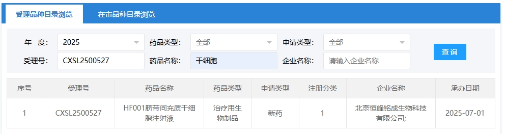 新增受理4:2025年07月01號,北京恒峰銘成生物科技有限公司申報的“HF001臍帶間充質干細胞注射液”的臨床試驗申請獲受理(受理號:CXSL2500527),這是該款細胞注射液第1次獲得受理。
