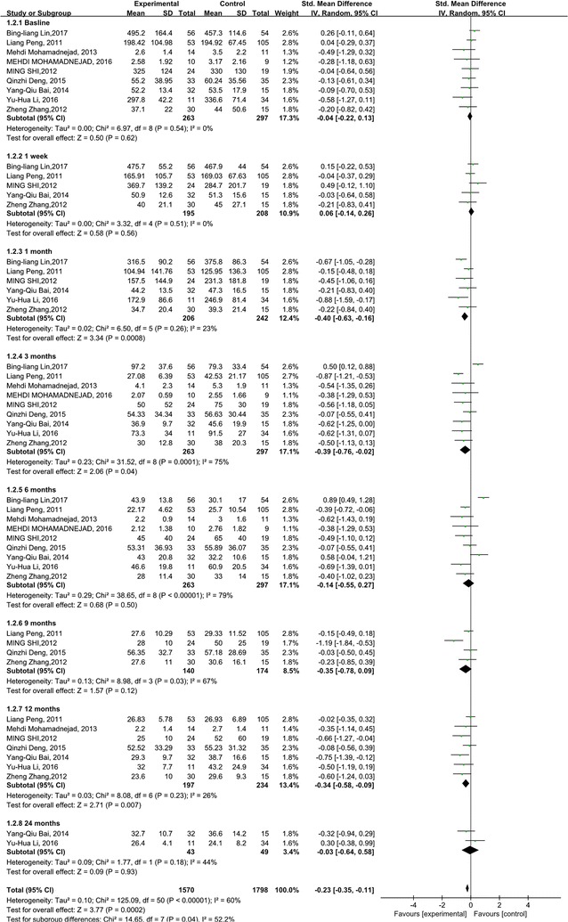 與對照組相比,干細胞治療后ALT水平顯著降低(p<0.00001)(圖5)。亞組分析顯示,干細胞治療組ALT水平也有所降低,在1周、1個月和6個月時間點均低于基線和相應(yīng)對照組。干細胞治療后9、12和24個月時ALT水平無顯著差異。關(guān)于1周、6和9個月時的ALT水平,未發(fā)現(xiàn)異質(zhì)性。但是,應(yīng)考慮1、3和12個月時 ALT水平的異質(zhì)性。但這只能通過一兩項研究來解釋。