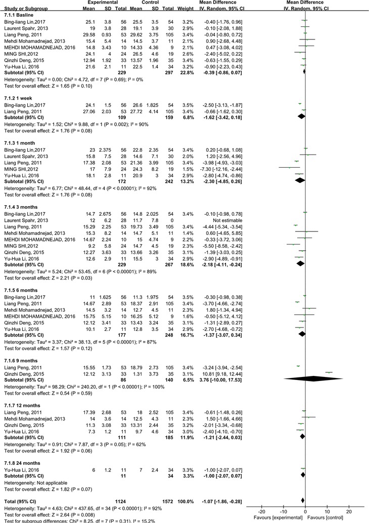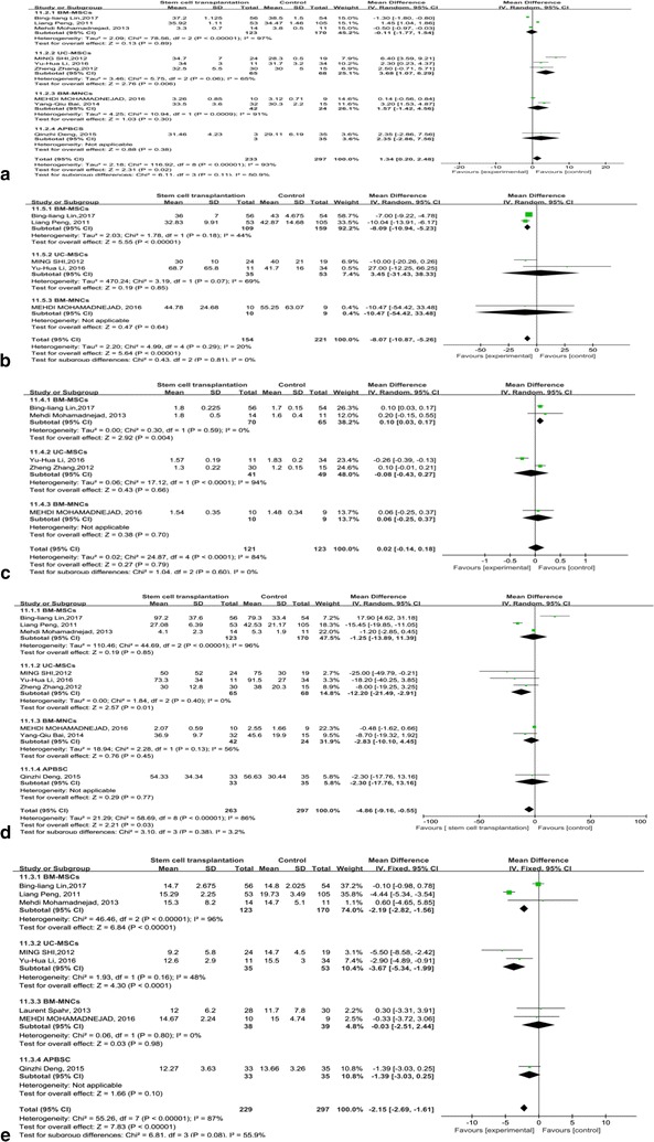 MELD評分主要用于評估終末期肝病的預(yù)后。我們觀察到干細胞治療組和對照組的MELD評分均有所下降。干細胞治療組和對照組之間存在顯著差異 (p =0.008)(圖6)。此外,盡管進行了亞組分析,但這些研究的異質(zhì)性很高 (I 2 : 62–100%)。但這也可以僅通過一兩項研究來解釋。