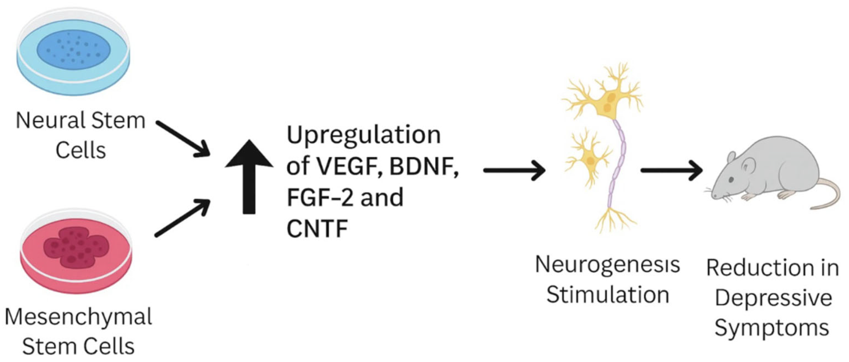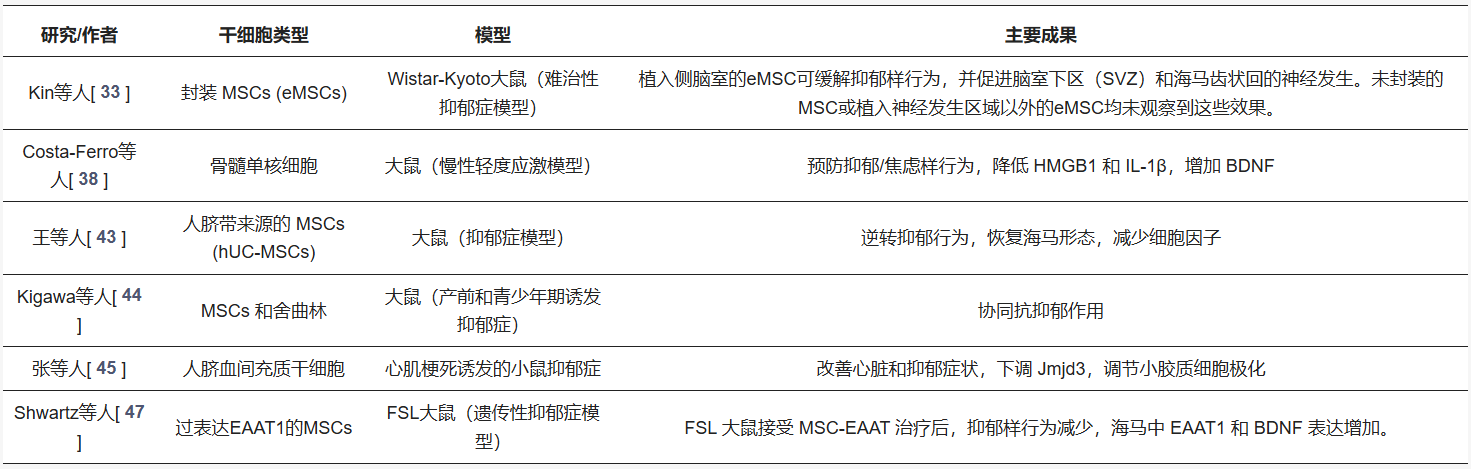 臨床前研究表明,基于干細胞的療法,尤其是涉及間充質干細胞 (MSC) 的療法,在治療抑郁癥方面擁有巨大的潛力。使用各種抑郁癥動物模型(包括慢性應激模型和像Wistar-Kyoto大鼠這樣的難治性品系)進行的研究表明,MSC以及細胞包被和細胞外囊泡 (EV) 等相關方法可以顯著減少抑郁樣行為。