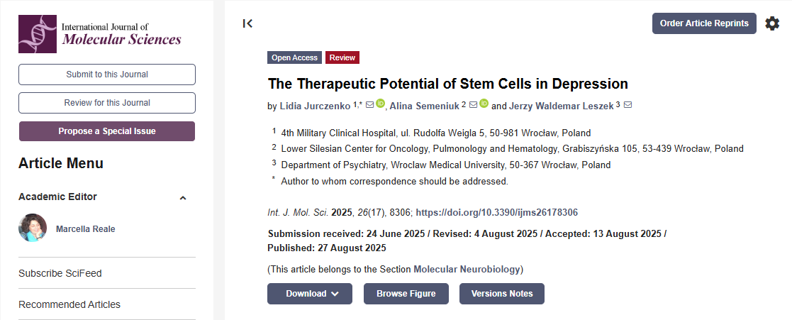 在此背景下,2025年8月27號,國際分子科學雜志發表了一篇題為“干細胞在抑郁癥中的治療潛力”的研究文章[1]。