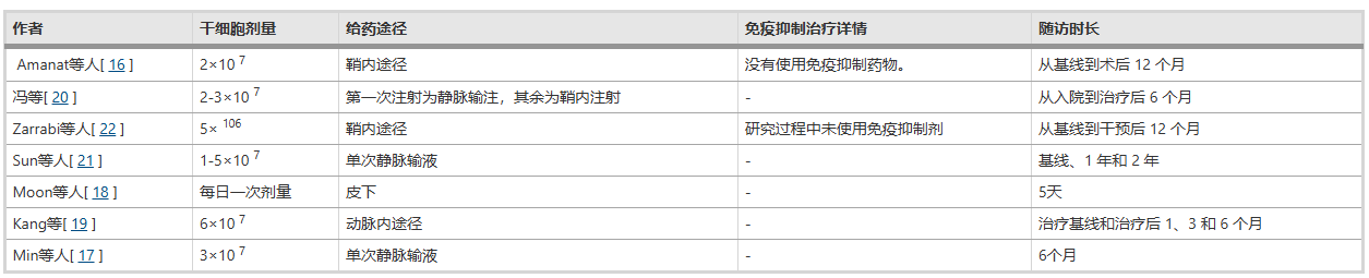 表2:所審查研究中有關干細胞劑量、給藥途徑、免疫抑制細節和隨訪時間的信息