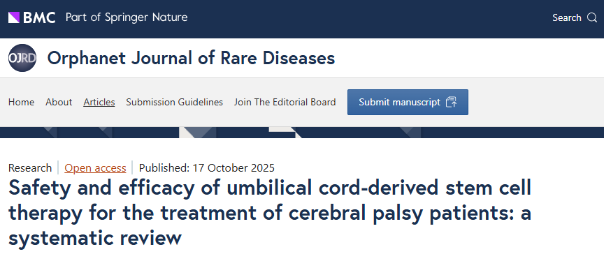 [1]:Salari, N., Morddarvanjoghi, F., Hosseinian-Far, A. et al. Safety and efficacy of umbilical cord-derived stem cell therapy for the treatment of cerebral palsy patients: a systematic review. Orphanet J Rare Dis 20, 518 (2025). https://doi.org/10.1186/s13023-025-04029-z
