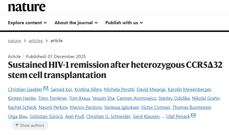 [1]Gaebler, C., Kor, S., Allers, K. et al. Sustained HIV-1 remission after heterozygous CCR5Δ32 stem cell transplantation. Nature (2025). https://doi.org/10.1038/s41586-025-09893-0