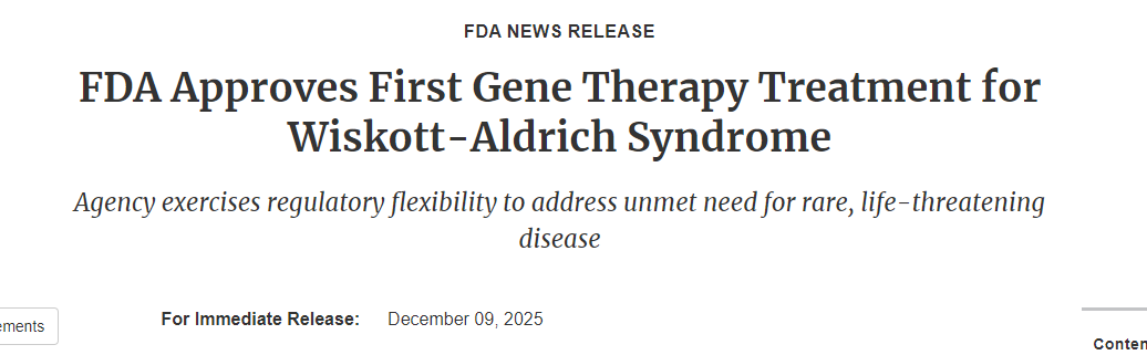 12月9日,FDA正式批準了etuvetidigene autotemcel(商品名:Waskyra),這也是全球首個獲批用于 Wiskott-Aldrich綜合征(WAS)的細胞基因療法。該療法適用于6個月及以上的兒童和成人WAS患者,這類患者通常因 WAS 基因突變導致免疫系統功能嚴重缺陷。[3]