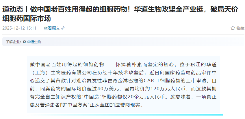 12月12日,我國華道(上海)生物醫藥有限公司向國家藥監局藥品審評中心(CDE)遞交了首款自主研發的 CAR?T 細胞藥物上市申請,該藥物主要用于難治復發性非霍奇金淋巴瘤(r/r NHL)。這款產品完全自主創新,從核心原料到生產設備均實現國產化,打破了對進口依賴。[5]