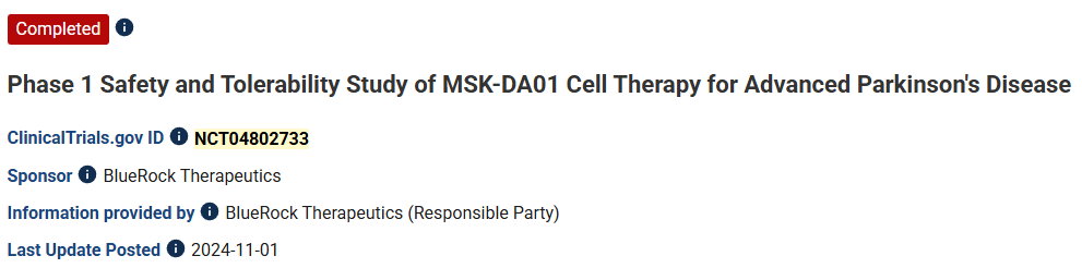02、標題:評估人胚胎干細胞衍生中腦多巴胺神經元細胞療法(MSK-DA01)治療晚期帕金森病的安全性和耐受性的I期研究