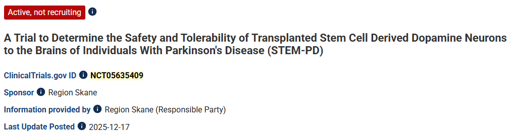 [1]:1.Kayhanian S, Barker RA. Clinical trial highlights: Dopamine cell-replacement therapies. Journal of Parkinson’s Disease. 2025;0(0). doi:10.1177/1877718X251397277.