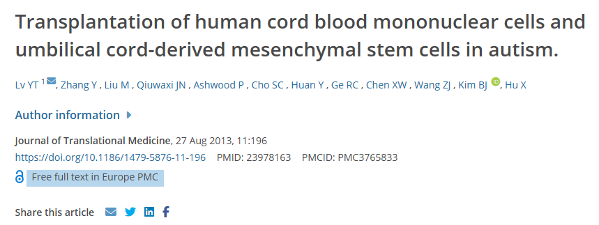 [2]:Lv YT, Zhang Y, Liu M, Qiuwaxi JN, Ashwood P, Cho SC, Huan Y, Ge RC, Chen XW, Wang ZJ, et al: Transplantation of human cord blood mononuclear cells and umbilical cord-derived mesenchymal stem cells in autism. J Transl Med. 11:1962013. View Article : Google Scholar : PubMed/NCBI