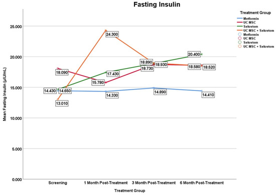 空腹胰島素:如圖5所示,分泌組治療組和UC-MSC+分泌組聯(lián)合治療組的空腹胰島素水平均顯著升高,但起效時間點不同。分泌組在第6個月時(Δ=5750±8.25;p=0.028)達到峰值,而UC-MSC+分泌組在第1個月(11290±18.24μIU/mL ( p=0.047))至第3個月(5920±8.20;p=0.047)達到峰值。二甲雙胍單藥治療組和UC-MSC單藥治療組均未觀察到顯著的縱向變化。