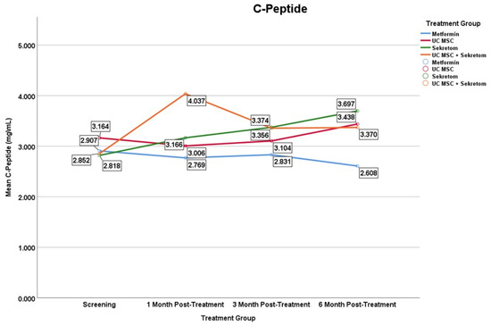 - 二甲雙胍組與UC-MSC組:在整個隨訪期內均未觀察到C肽的顯著變化。