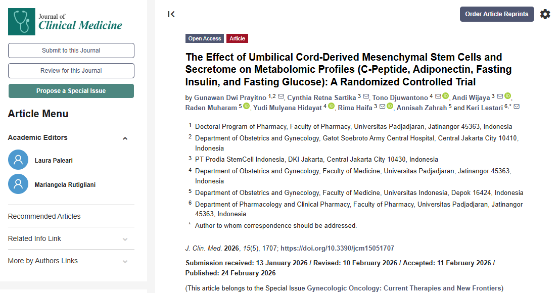 [1]:Prayitno, G.D.; Sartika, C.R.; Djuwantono, T.; Wijaya, A.; Muharam, R.; Hidayat, Y.M.; Haifa, R.; Zahrah, A.; Lestari, K. The Effect of Umbilical Cord-Derived Mesenchymal Stem Cells and Secretome on Metabolomic Profiles (C-Peptide, Adiponectin, Fasting Insulin, and Fasting Glucose): A Randomized Controlled Trial. J. Clin. Med. 2026, 15, 1707. https://doi.org/10.3390/jcm15051707
