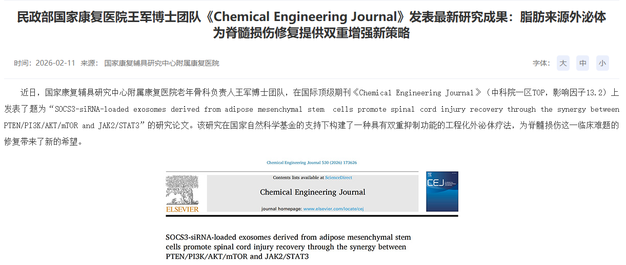 近期,民政部國家康復(fù)醫(yī)院王軍博士團(tuán)隊(duì)在國際期刊《Chemical Engineering Journal》發(fā)表研究成果,利用工程化脂肪干細(xì)胞外泌體為脊髓損傷修復(fù)提供“雙重增強(qiáng)”新策略。該研究通過裝載SOCS3-siRNA的工程化外泌體,同時(shí)抑制PTEN與SOCS3兩條關(guān)鍵通路,在神經(jīng)再生與抗炎方面展現(xiàn)協(xié)同效應(yīng),為這一臨床難題帶來全新解決方案。