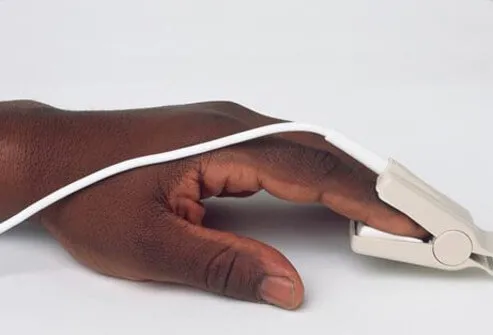 COPD診斷的一個重要部分是體格檢查,患者的呼吸史、吸煙史和COPD家族史。執行的第一個簡單的非侵入性測試通常使用脈搏血氧儀(如本幻燈片的圖片所示)。血氧儀測量血液中的氧氣量(飽和度百分比)。這是一種測試有多少氧氣被輸送到離心臟最遠的身體部位(例如手臂和腿)的方法。脈搏血氧計放置在身體部位(手指、耳垂)上,使用光來測量氧氣水平。