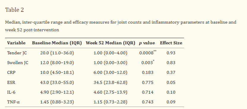 表2:基線和干預(yù)后第52周的關(guān)節(jié)計(jì)數(shù)和炎癥參數(shù)的中位數(shù)、四分位間距和療效測(cè)量。
