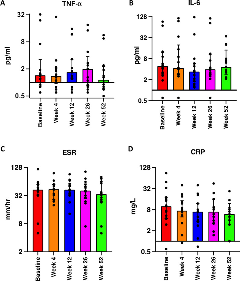 圖3:炎癥參數(shù)。與基線相比,后續(xù)訪問(wèn)中炎癥細(xì)胞因子、TNF-α或IL-6的水平未顯示任何顯著變化 (a , b)。