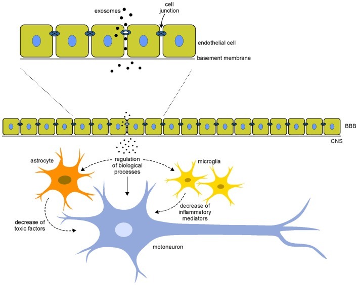 使用外泌體治療神經(jīng)退行性疾病的越來越多的關(guān)注源于外泌體穿過血腦屏障的能力,血腦屏障是將腦實(shí)質(zhì)與中樞神經(jīng)系統(tǒng)中的循環(huán)血液分開的生理屏障。如前所述,目前對(duì)神經(jīng)退行性疾病的治療通常是有癥狀的,不會(huì)阻止退化過程;治愈這些病癥的主要問題是細(xì)胞和藥物無法穿過血腦屏障。最近的研究報(bào)告說,與微泡不同,外泌體可以穿過血腦屏障:假設(shè)是外泌體被內(nèi)皮細(xì)胞內(nèi)化,并且通過釋放特定的貨物,它們影響細(xì)胞連接的完整性,增加細(xì)胞之間的滲透性并允許大量進(jìn)入中樞神經(jīng)系統(tǒng)中的囊泡,在那里他們可以發(fā)揮神經(jīng)保護(hù)作用(圖2)。