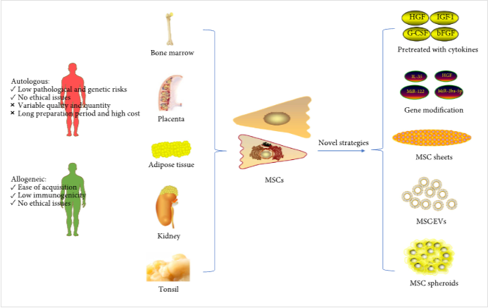MSCs可以從各種來源獲得,包括骨髓、胎盤、脂肪組織、腎臟和扁桃體。自體和同種異體MSC具有不同的治療特性。