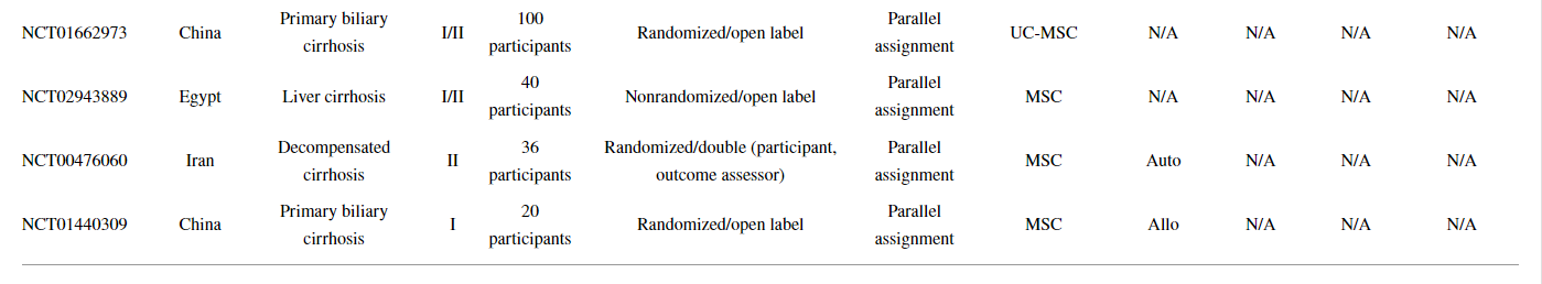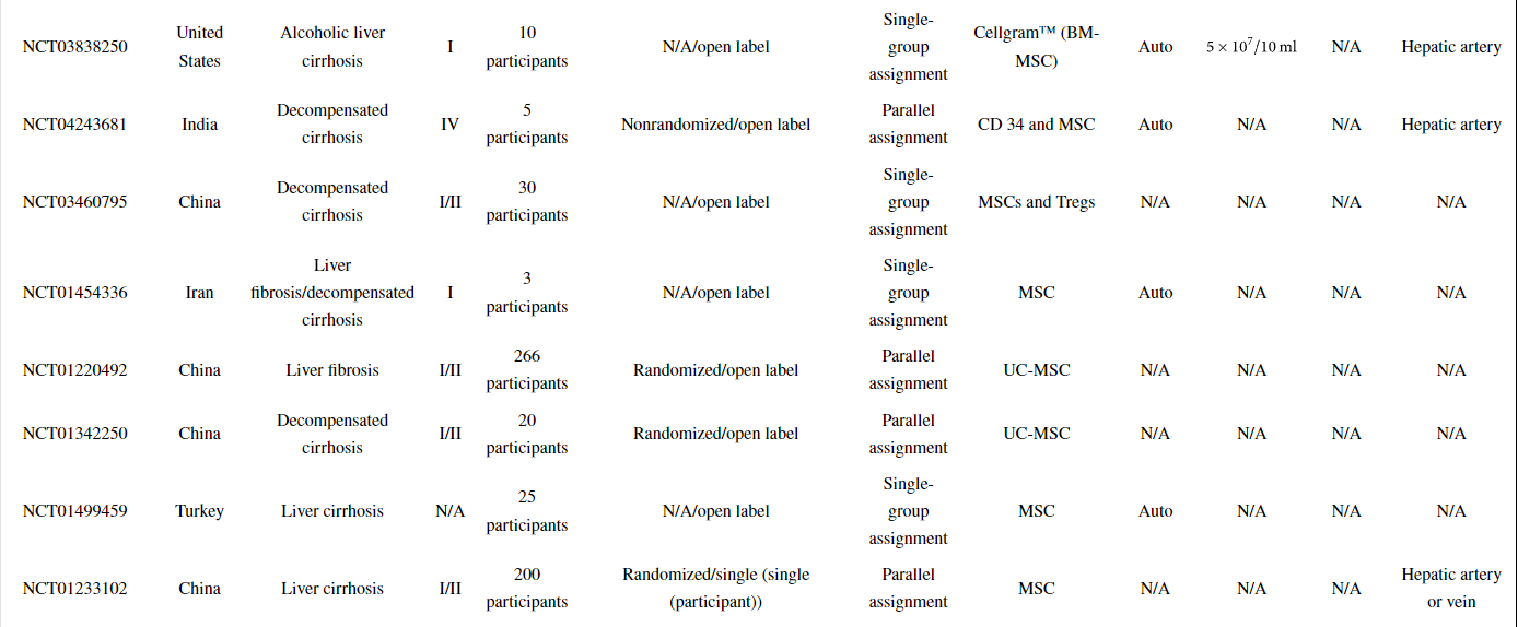以上顯示了31項已完成或正在進行的MSC治療或MSC聯合細胞治療肝硬化(LC)的臨床試驗。同時,已經發(fā)表了許多描述使用MSCs進行臨床試驗結果的報告。