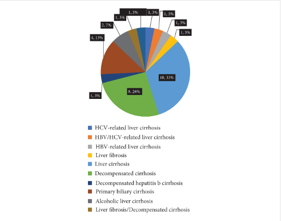 31例肝硬化的病因略有不同。肝硬化10例(32.3%),失代償期肝硬化8例(25.8%)。第三肝硬化為原發(fā)性膽汁性肝硬化,4例(12.9%)。酒精性肝硬化2例(6.5%),HCV相關性肝硬化、HBV相關性肝硬化、肝纖維化、失代償性乙型肝炎肝硬化各1例(3.2%)。肝纖維化和失代償期肝硬化1例(3.2%),肝纖維化和肝硬化1例。肝硬化的病因體現了不同疾病的發(fā)病率,可能為相應的干預提供潛在的方法(圖3(b)))。
