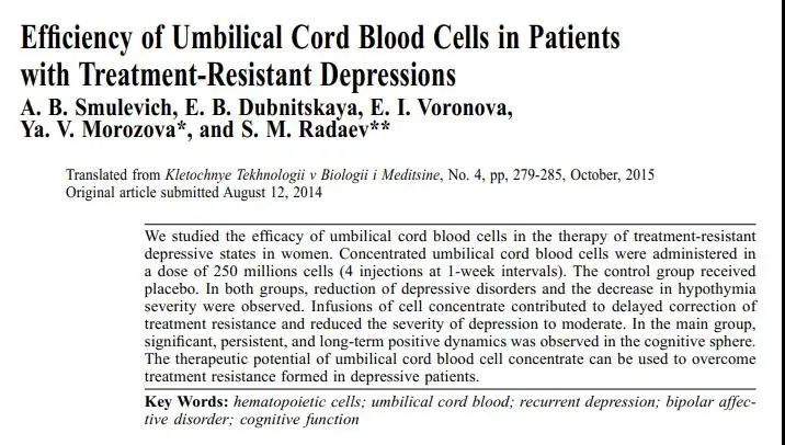 2014年,俄羅斯科學(xué)家使用臍帶血治療13名復(fù)發(fā)難治性抑郁癥患者,結(jié)果發(fā)現(xiàn)臍帶血有助于難治性抑郁癥的治療,特別是認(rèn)知-情感亞量表的改善。