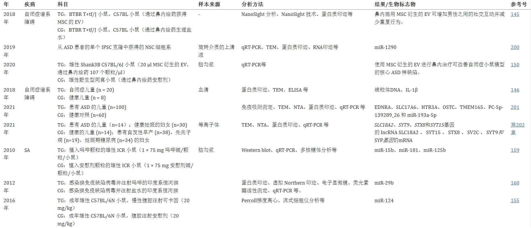 相關(guān)研究還表明,EVs在其他精神障礙(包括ASD、SA、SD和創(chuàng)傷后應(yīng)激障礙)中也起著關(guān)鍵作用。表1總結(jié)了最新和有代表性的前期和臨床研究。值得注意的是,這些精神疾病與前述疾病(包括精神分裂癥、MDD和BD)之間的易感性有重疊,這很可能可以通過相同EVs或其載體的失調(diào)來治療。