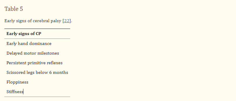 最近的一項研究表明,最常見的癥狀是在2歲之前使用單手,無法在適當?shù)臅r間內達到正常的里程碑,以及在一定時期后出現(xiàn)原始反射(表5) 。