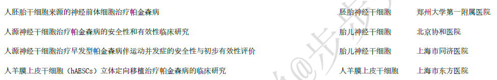 干細胞治療帕金森病目前也是一個不錯的選擇。國內也有機構正在積極開展治療帕金森的干細胞療法臨床研究。在兩委局,干細胞臨床研究備案項目目前有4個,細胞來源有3種(分別hESC衍生的神經前體細胞,胎兒神經干細胞和羊膜上皮干細胞),如下表: